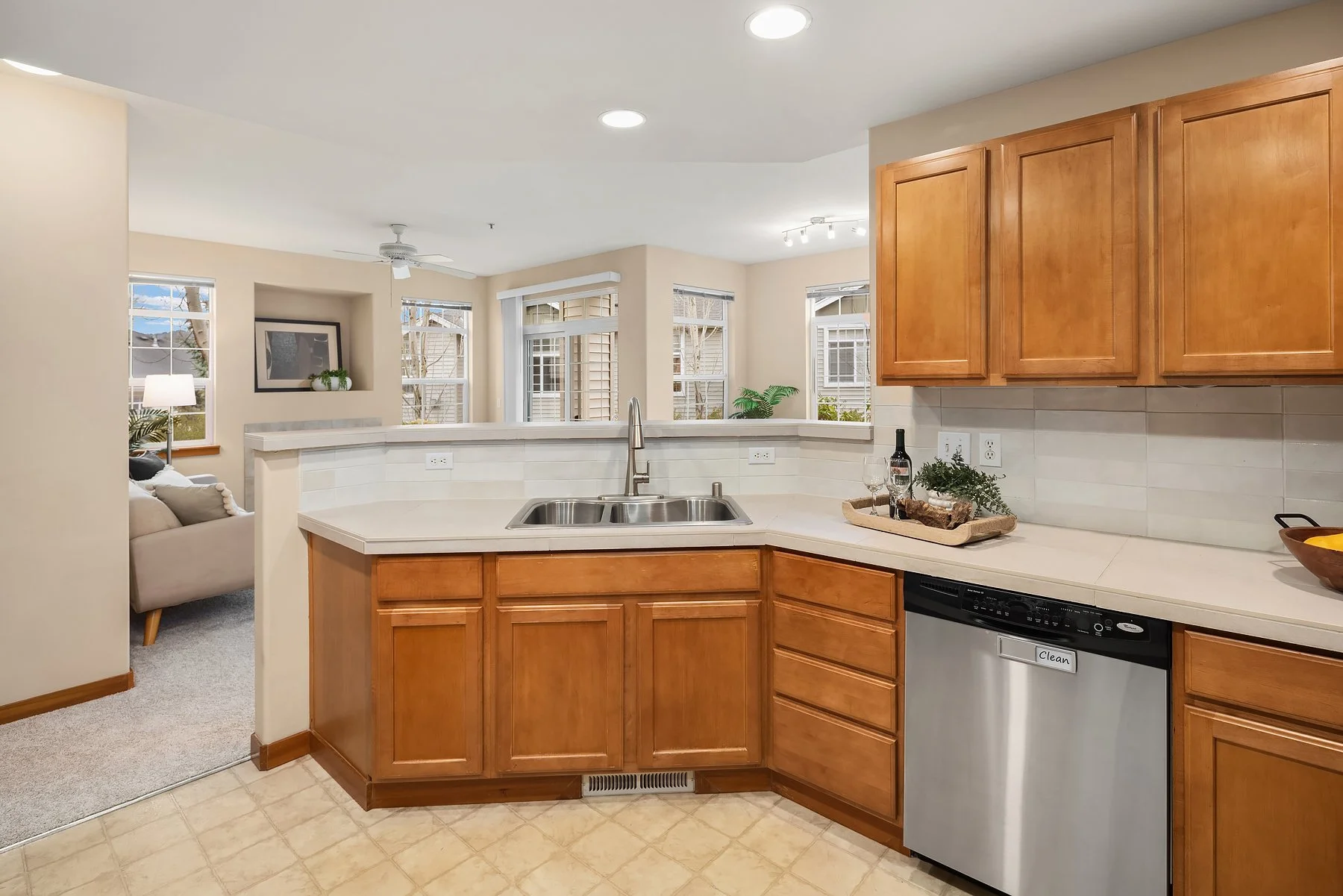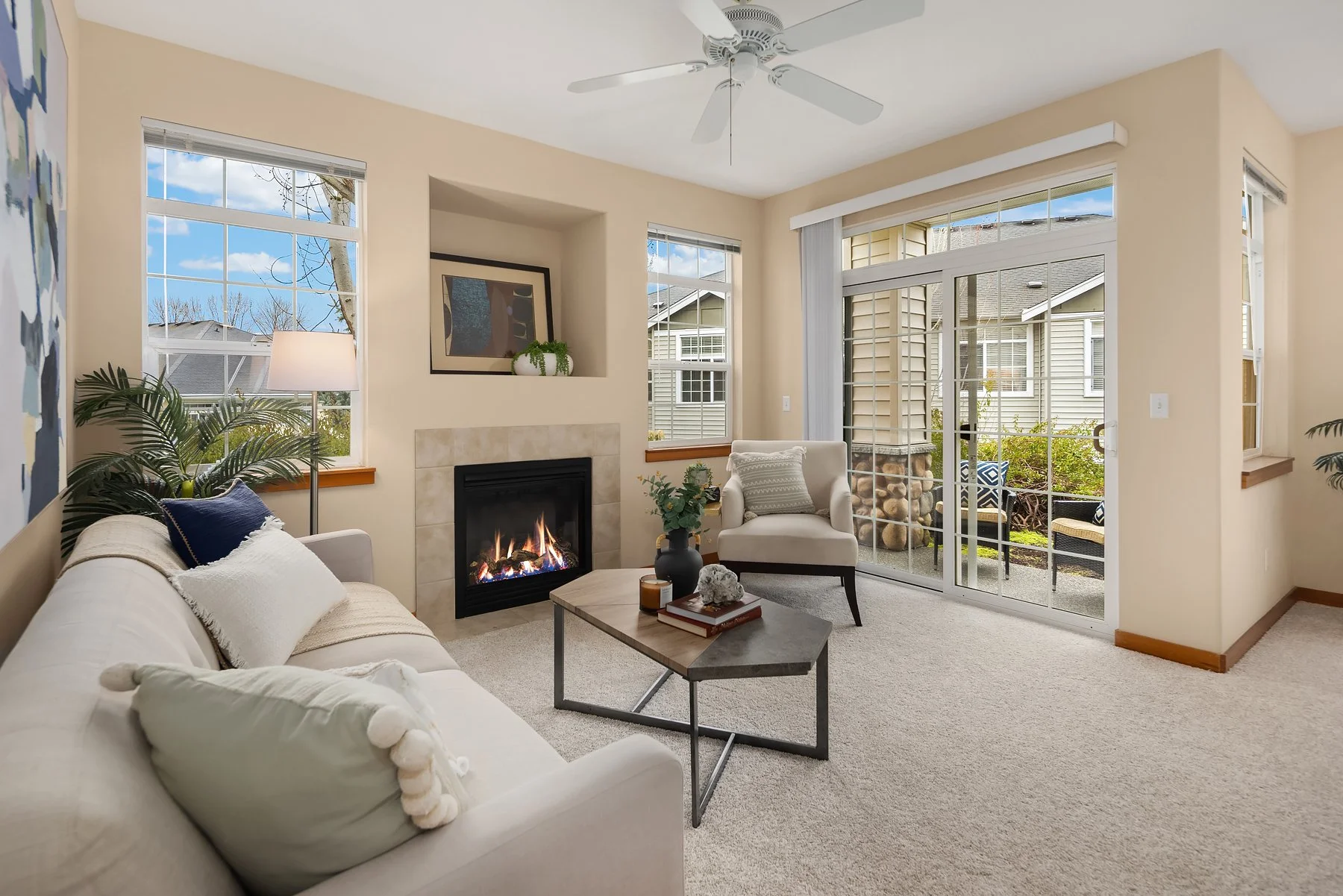 This rarely available south and east-facing end-unit is filled with natural daylight, relaxing breezes, and seamless walk-out patio access to the beautiful grassy quad & a Cascade mountain backdrop — perfect for morning coffee, pets, and easy indoor/outdoor living. No stairs means effortless and convenient everyday living: pull into your extra-wide garage and step directly inside with groceries, sleeping little ones, or armfuls from Costco.